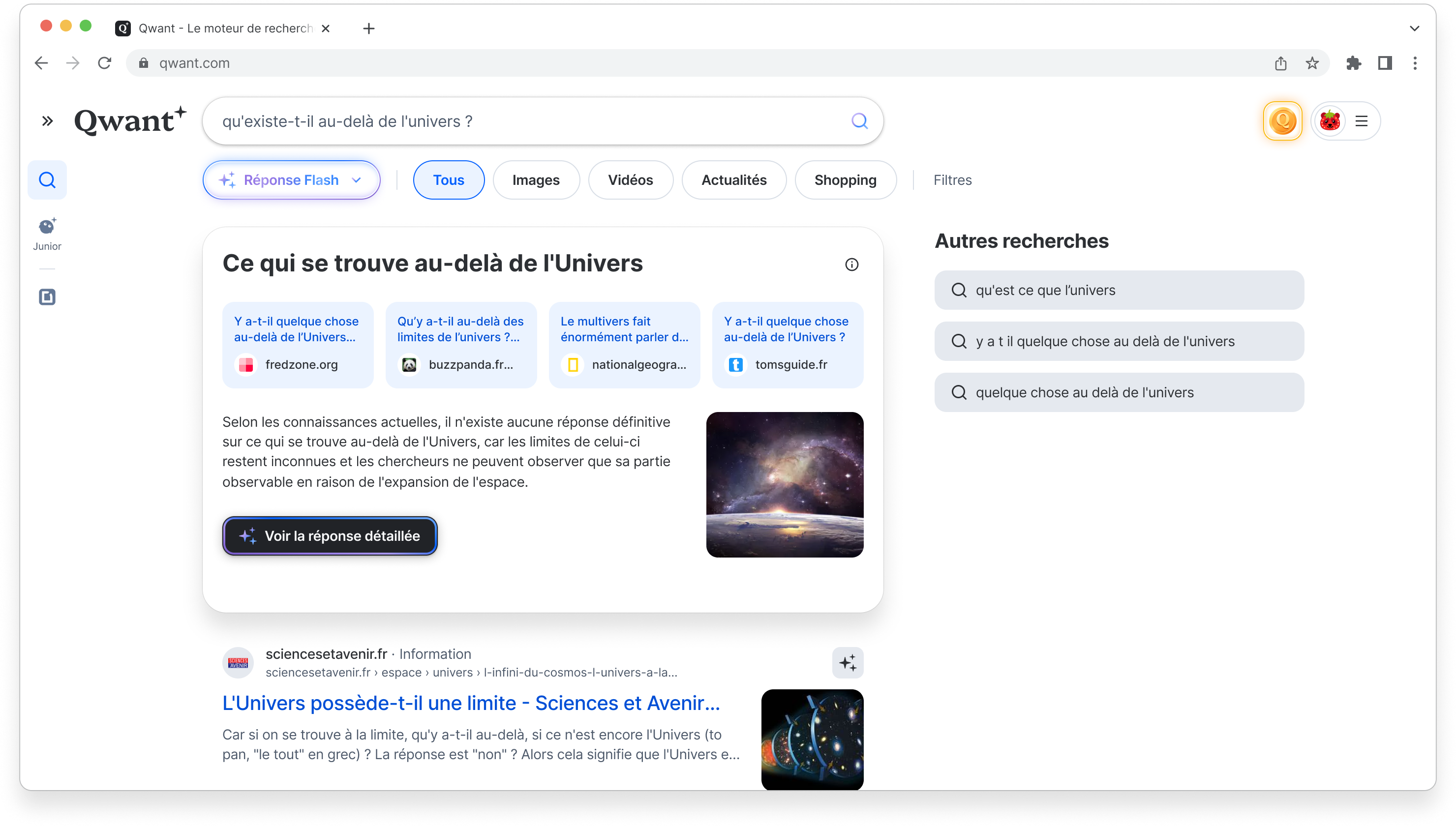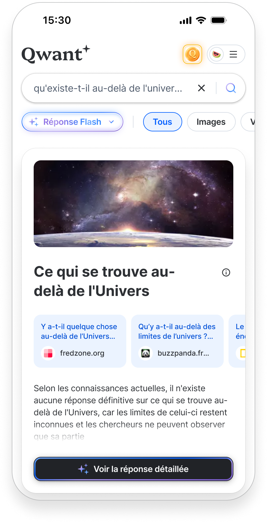 Pendant 9 ans en tant que UI puis UX designer chez Qwant, j’ai fait évoluer le moteur en optimisant l’expérience et l’impact business. Dernière réalisation : la réponse Flash (module IA generative), qui a boosté les performances du site :